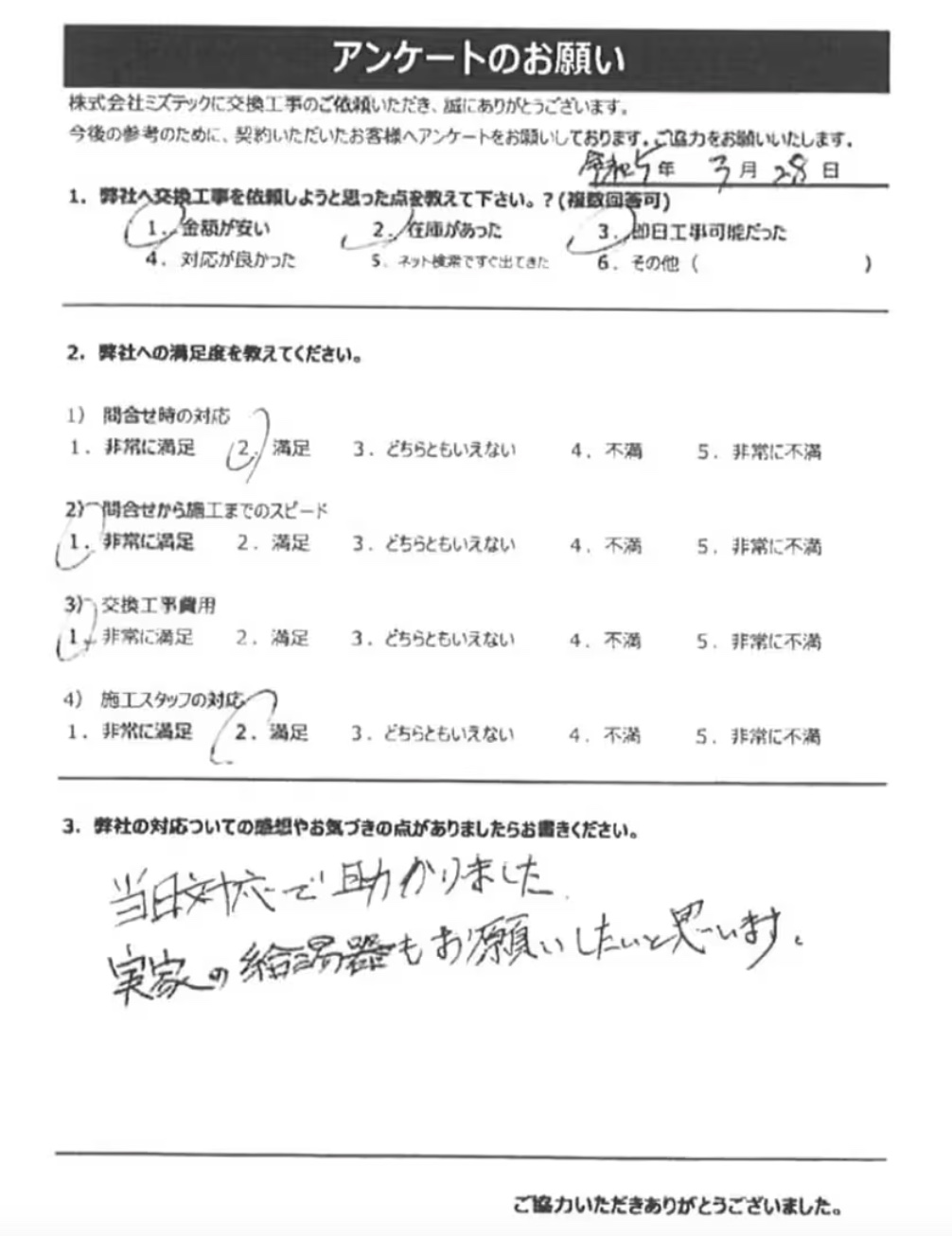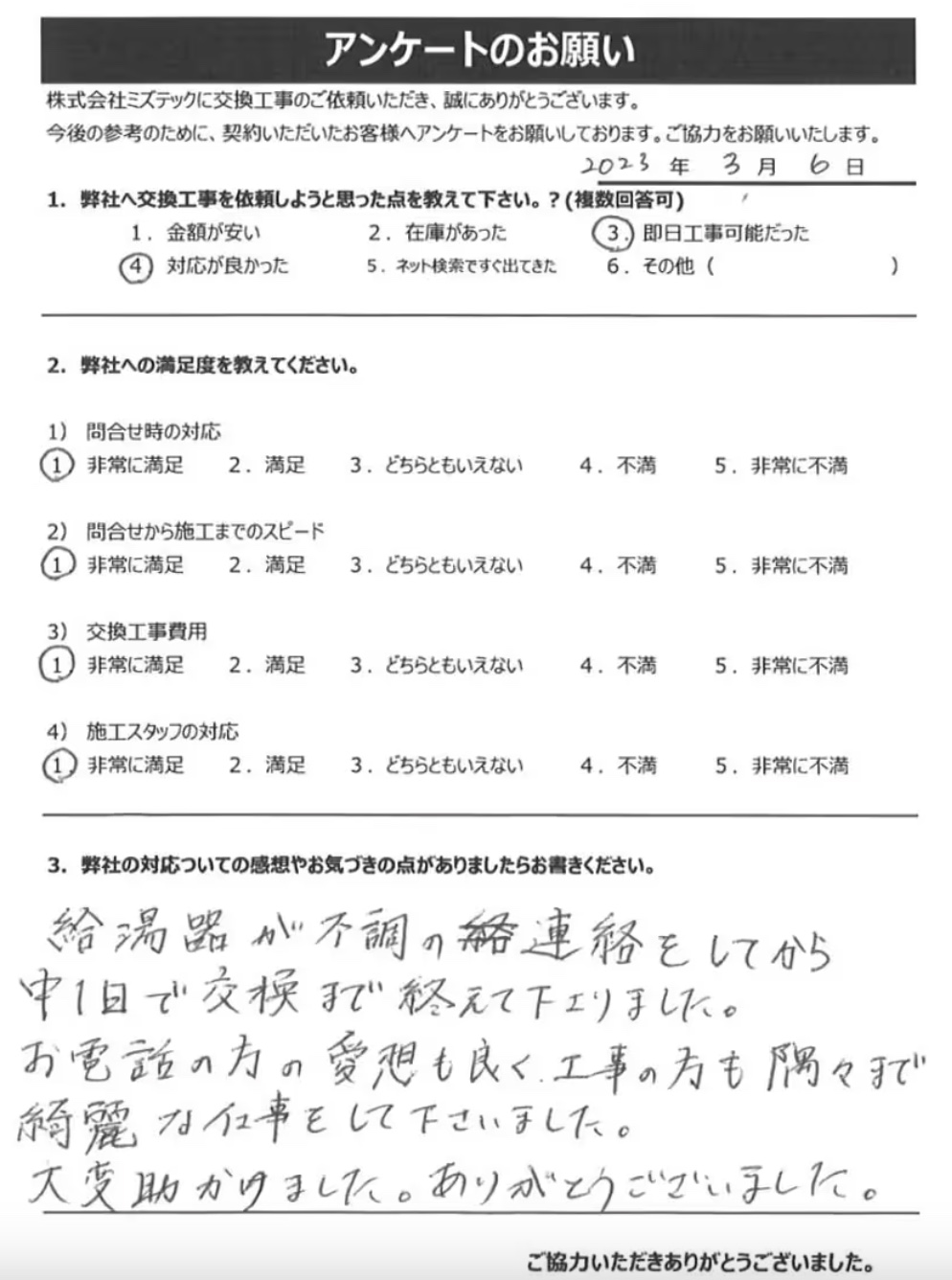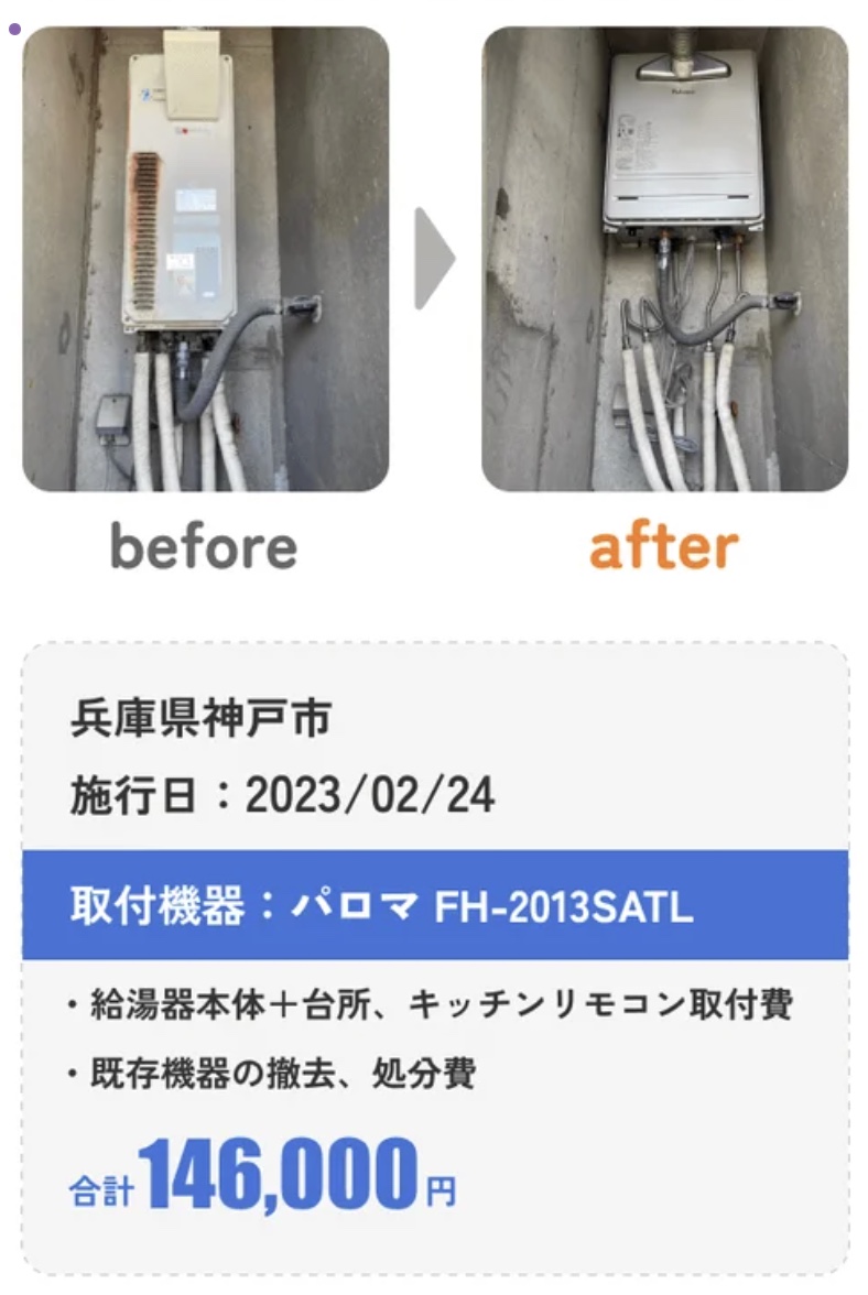 ネットから給湯器交換の申込をした所、即見積が出て、当日対応可能との事。金額も安かったので、そのままお願いしました。 作業に来て下さった方の対応が素晴らしく、とても満足しています。 無償で10年保証が付いているのもありがたかったです。 またお願いしたいです。
