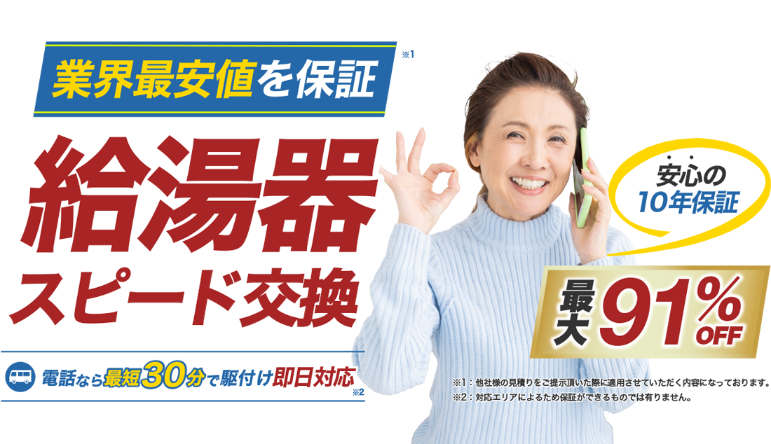 | 給湯器修理 交換実績 30,000台以上 | 24時間 365日 | 最短30分 | 最大 82%OFF |